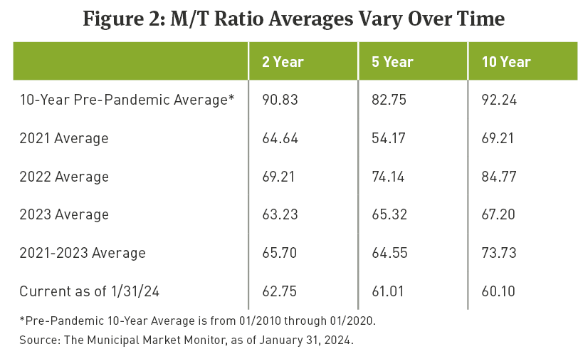 For much of the past 30 years, the M/T Ratio has averaged between 80 percent to 90 percent across much of the Intermediate yield curve and even higher on the longer end of the curve. Looking back 10 to 12 years ago, ratios often traded well above that average for extended periods (See Figures 1 and 2).